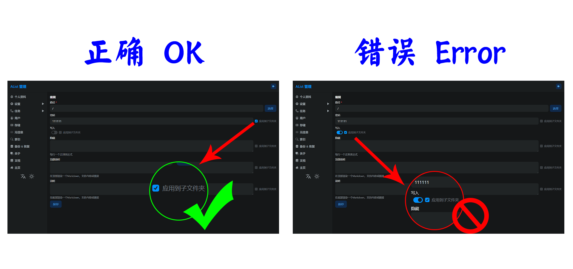 ❌ You cannot directly fill in the meta information of the root directory /, and then fill in the folder we want to hide, the error case View details